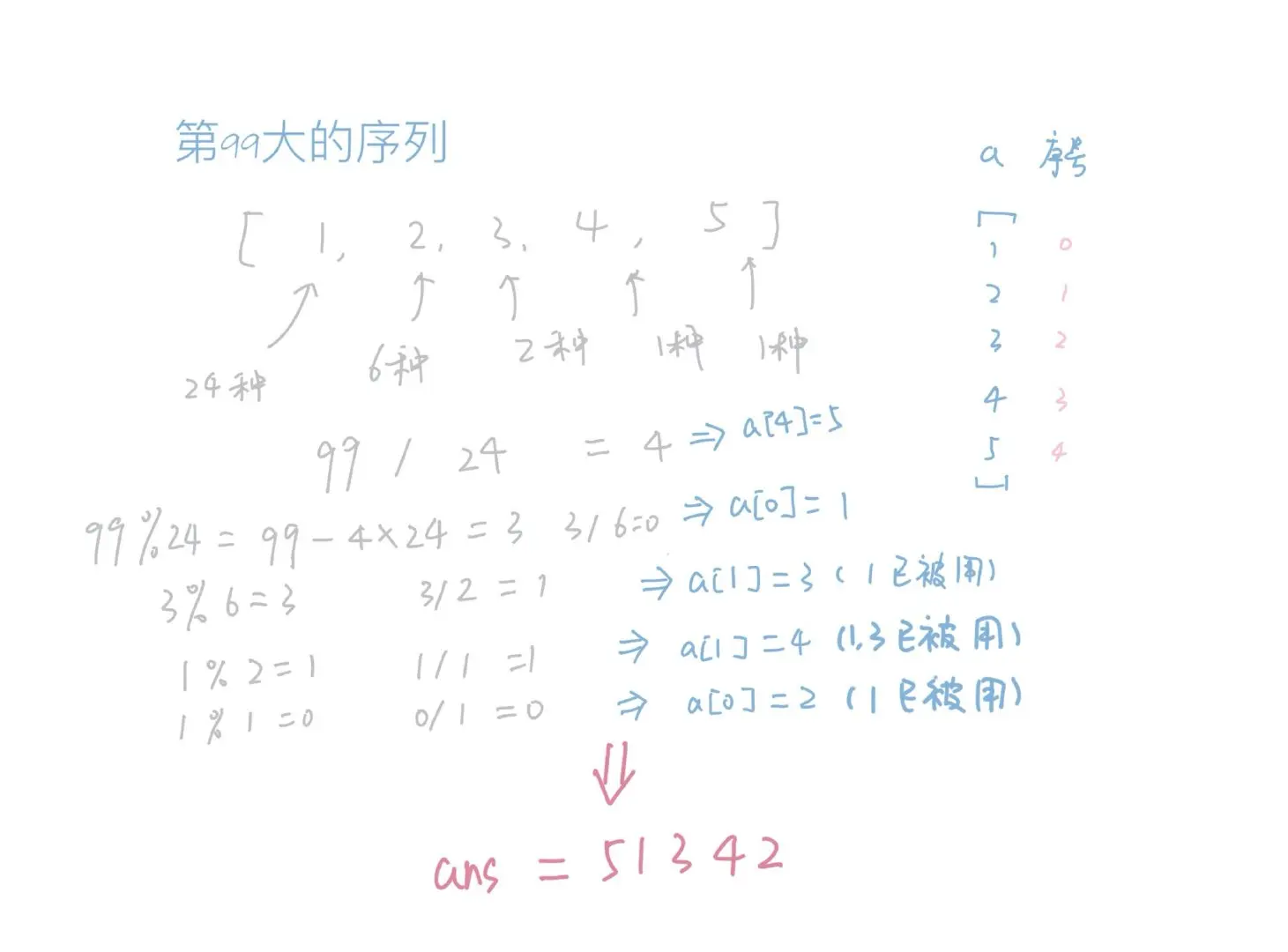 我们来举个例子吧,假设我们现在n=5,我们算一下会知道,一共有120种排列。假设我们要求第100个排列,由于从0开始,所以也就是第99大的排列。那么根据我们刚才说的,我们已经知道每个数字开头的情况都是4!也就是24种,那么我们用99/24得到4,所以开头的数字是第4大的数(第0大的是1),也就是5。答案一下子缩小了很多,那接下来呢?接下来我们用99减去5之前的所有情况,也就是96种,得到3。也就说答案是5开头的第3个排列,那么我再问,第二个数字是多少?
