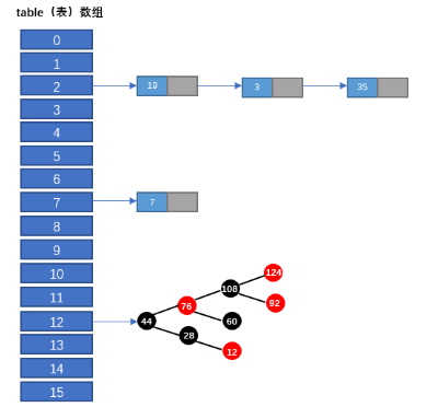 但除法运算要比 与运算&慢得多,因此我们用&代替%,当table数组的长度为2的幂次方n时,table.length - 1是一个后低(n-1)位都为1的二进制,以数组初始长度16为例,16-1=15,与计算出的哈希值做 “与运算”: