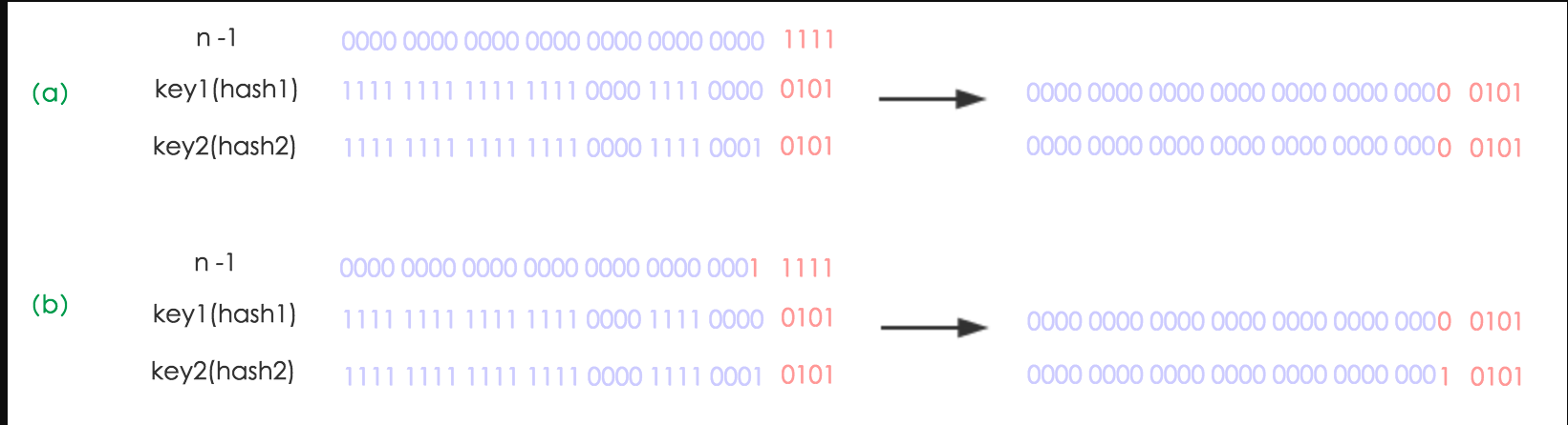 图(a)表示原数组中key1和key2对应的下标;图(b)则表示经过扩容后,数组的新长度为32,则新的n-1比原来的n-1移动了1bit。可以发现,key2的原下标00101(5)变成了10101(5 + 16) = 21。因此我们在计算要放入新数组的下标时,不需要向JDK1.7那样重新计算hash,只需判断原来的hash值新增的bit是0还是1即可:若是0则索引没变,否则新索引为原索引 + oldCap,此处的oldCap对应例子中的16.