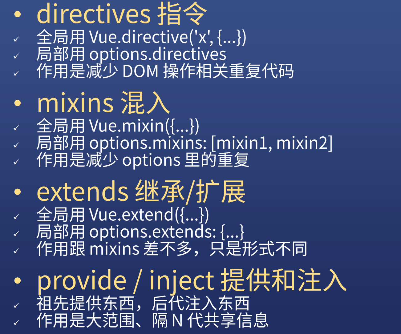 provide 选项应该是一个对象或返回一个对象的函数。该对象包含可注入其子孙的 property。