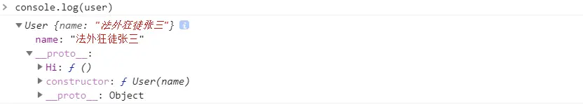 user.Hi() //user身上本来没有Hi方法的,通过__proto__属性去prototype(原型对象)身上找