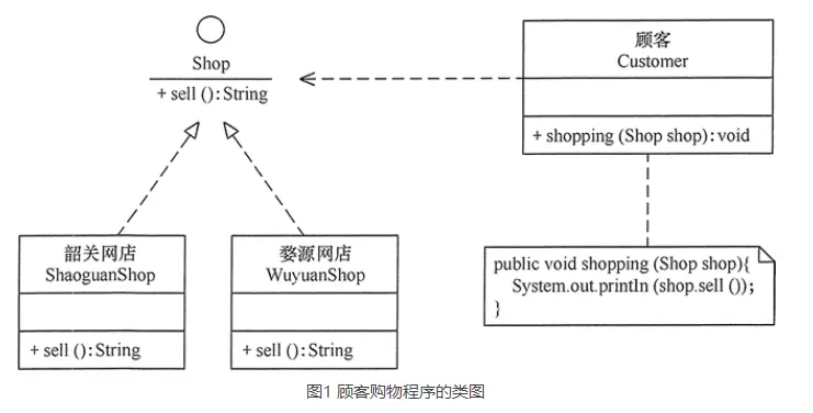这样,不管顾客类Customer访问什么网店,或者增加新的网店,都不需要修改原来代码,其类图如图1所示。