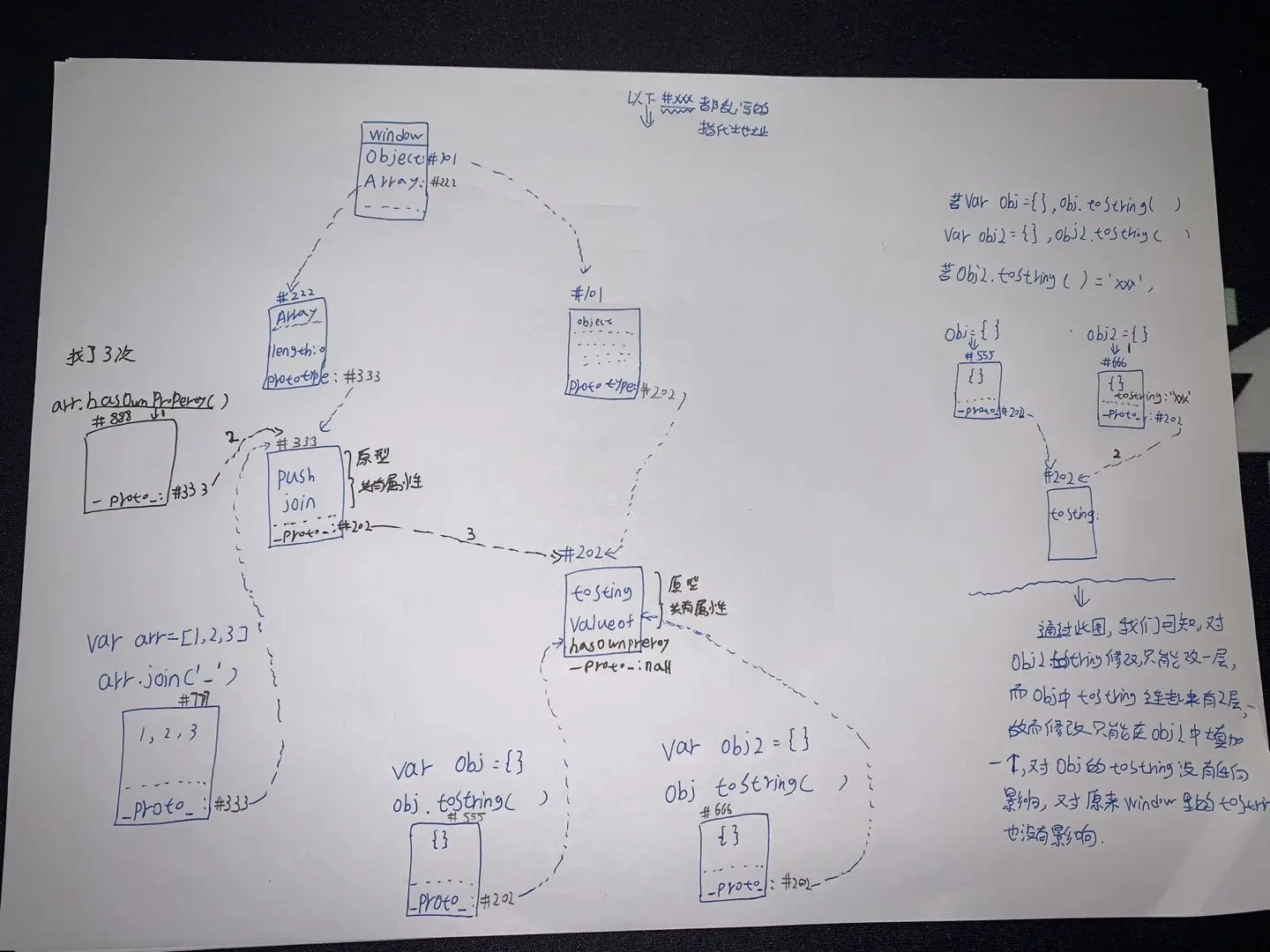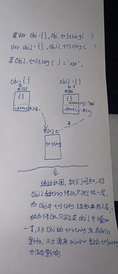 obj.toString()发现obj上没有toString这个属性,就去隐藏属性_proto_对应的对象里面Object. prototype找于是就找到了 Object. prototype. toString