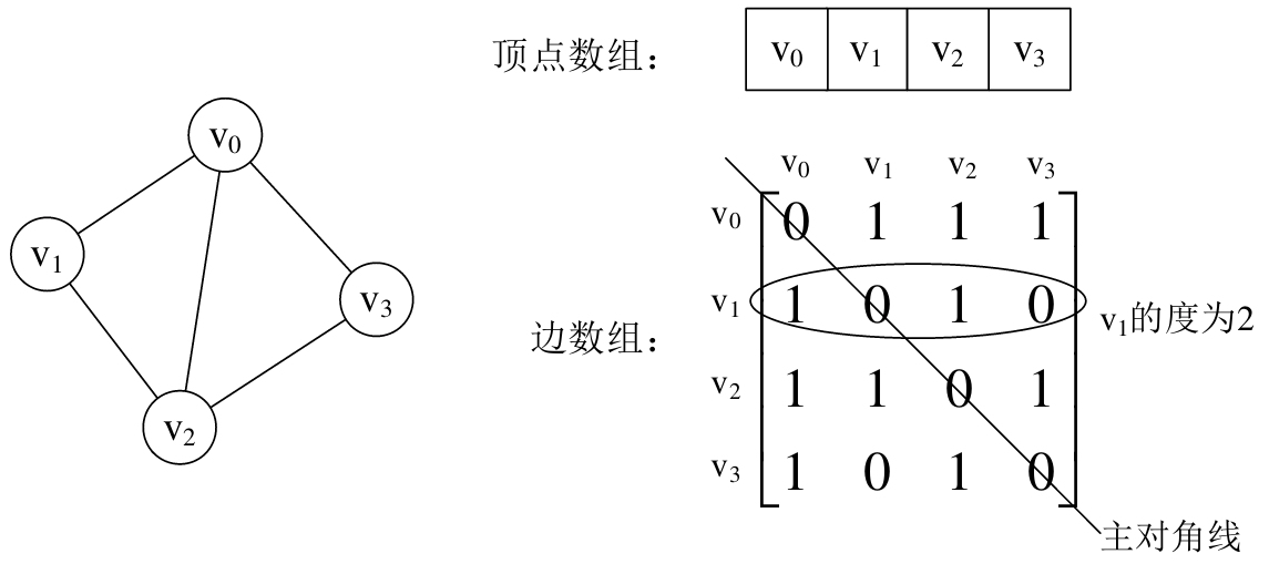 图的邻接存储方式是用两个数组来表示图, 一个用来存储顶点, 一个用二维数组来存储边或弧的信息, 这个二维数据就称为邻接矩阵.