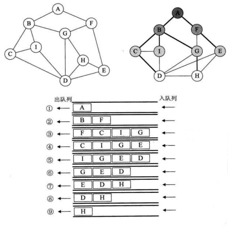 - A出队列, 入A的邻接结点B、F