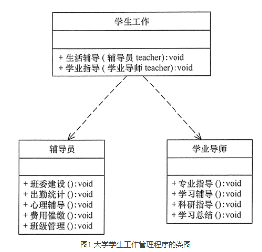 分析:大学学生工作主要包括学生生活辅导和学生学业指导两个方面的工作,其中生活辅导主要包括班委建设、出勤统计、心理辅导、费用催缴、班级管理等工作,学业指导主要包括专业引导、学习辅导、科研指导、学习总结等工作。如果将这些工作交给一位老师负责显然不合理,正确的做 法是生活辅导由辅导员负责,学业指导由学业导师负责,其类图如图 1 所示。
