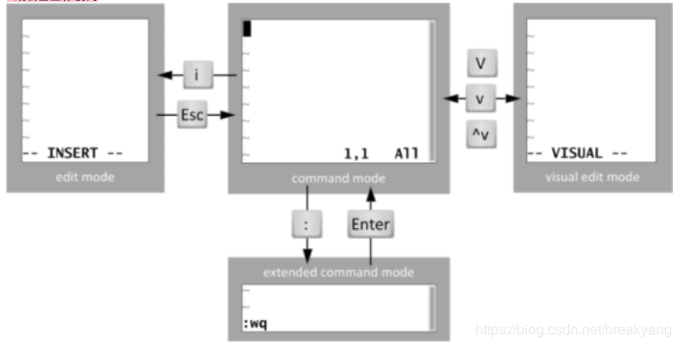 Vim 是以命名模式为中心,通过不同的指令进入其他模式: