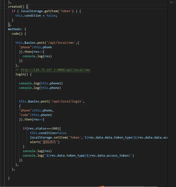 这个localstorage.getitem,这个可以测试是否有本地储存的数据,有这个数据就可以不用再次登录了,以及这个network,可以看这个信息,报错原因,如果这个200,res.status就是成功的,400就是自己的客户端的问题,500就是后端要解决的, this.rq.get('/api/product/get,{params:{name:'abc'}}).then(res=>{ console.log(res) }) 请求数据,然后res.data.token_type}${res.data.access_token拼接字符串,这个token是一个星期才会消失的,所以可以在本地储存这个数据,token是用来前端的检测合法性的相当于密匙的一个东西。