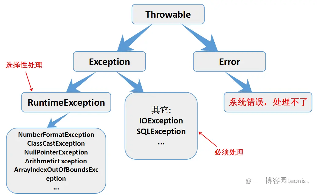 - Error 一般是跟虚拟机相关或者硬件相关的问题,系统崩溃,虚拟机错误,空间不足等, VisualMachineError, NoClassFoundError,Error错误Java编译器检查不到,对于这种问题导致的程序中断,靠程序本身无法恢复,只能终止程序;