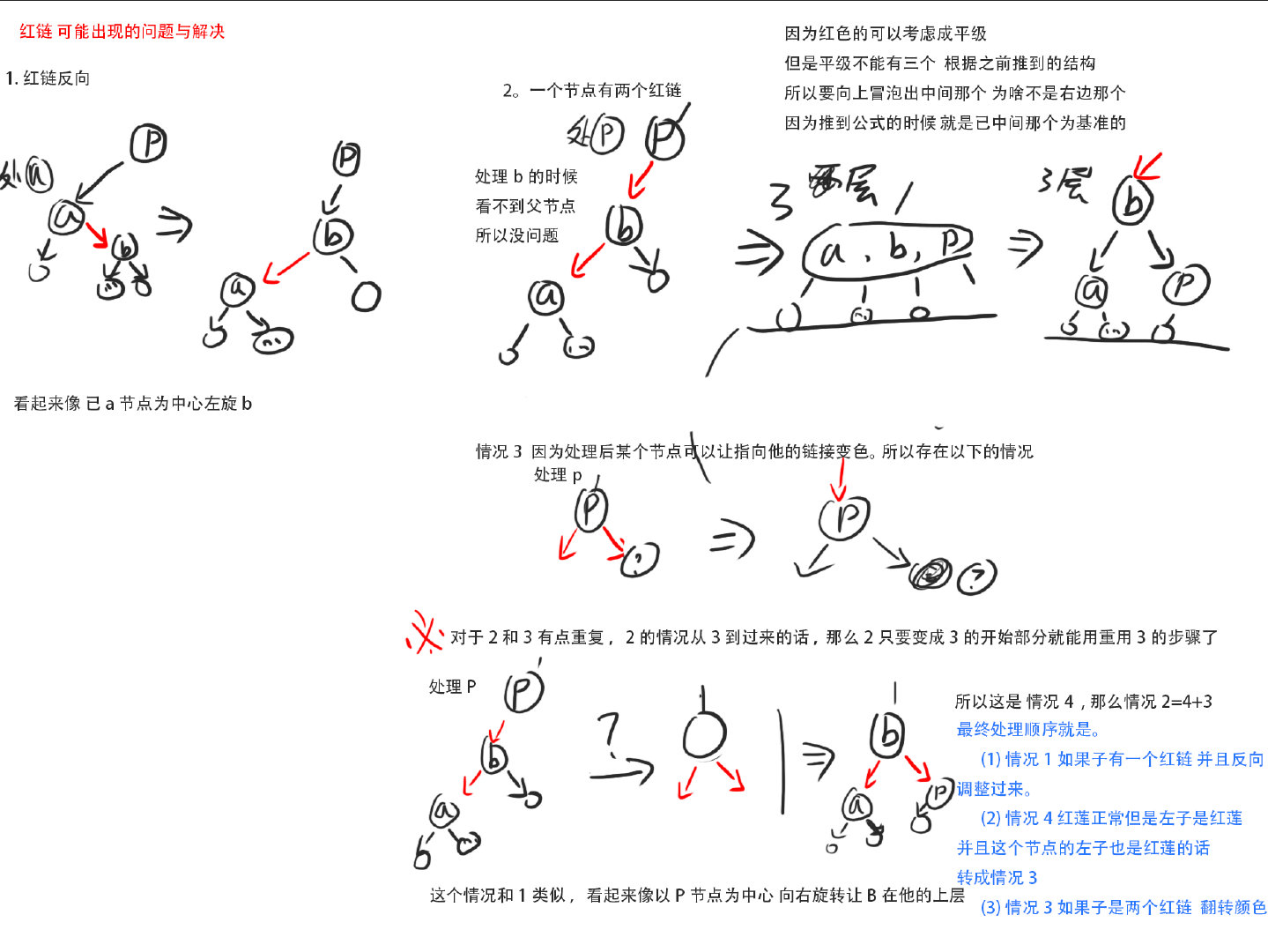 算法第4版的红黑树代码 有问题 刚开始我是不信的,我一直以为我代码的问题 自己检查对比 就是不行。后来看我推荐看的那个链接里 发现评论里有我一样的问题他说了。我才敢相信。虽然作者很强 应该赞扬,但是这个事情真的就很蛋疼。我就这个删除的理解硬是搞了3天 我一直觉得我也不笨 。对着算法书里删除的解释 就那两三页的介绍 不停的看,看了大概一天半,期间好几次想放弃。但是我越想越不服,都花费这么长时间了也不差时间了。然后各种上网找资料 奈何找到的都没法看,因为都是红黑树作者的规定,但是他为什么这么规定的 网上的资料却没人说 。感觉答案就靠硬背的感觉 感觉那种根本不算学会 而且我这种人记忆力超差的 如果不理解半天就忘记了,就算理解了 我一两天也忘记了 必须总结出非常易于理解的 然后每次忘记就看看,终于在推荐的那个网页找到了 一看就能看进去。后来发现算法第4版网站里对红黑树PDF的翻译 真的是太给力了。然后确实看懂了个大概。写下来然后加上自己前一天半的思想。从另一个方式理解红黑树。所有NIL的高度不变为核心去理解.总算写完了 内心也算舒畅了 希望能帮助更多的人理解红黑树。 顺便吐槽下 这个小圆实在是难画 多年不用笔了 感觉写字都发飘。 终于可以去学习新的算法了 不知道这本书啥时候能看完呢 俺(算法小白)还想刷刷lecode。