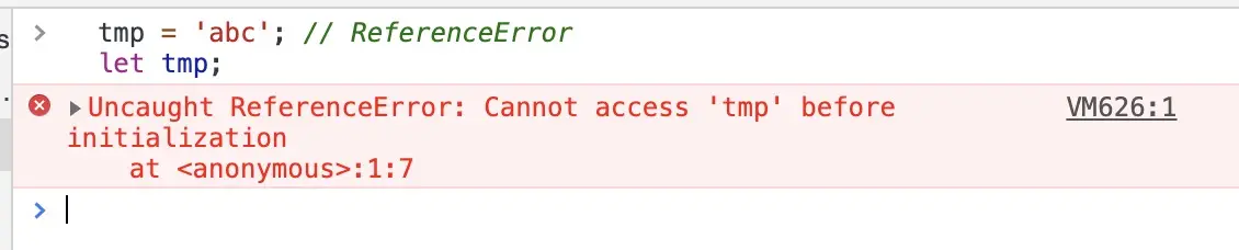 这就是暂时性死区的报错,初始化之前无法访问tmp。其实变量的整个创建过程包括:创建、初始化、赋值。所以 let 变量不会变量提升的真实情况是:在块作用域内,let声明的变量被提升,但变量只是创建被提升,初始化并没有被提升,在初始化之前使用变量,就会形成一个暂时性死区。