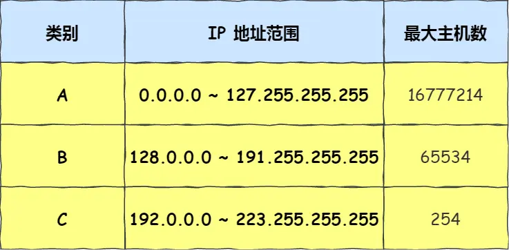 我们可以用下面这个表格, 就能很清楚的知道 A、B、C 分类对应的地址范围、最大主机个数。