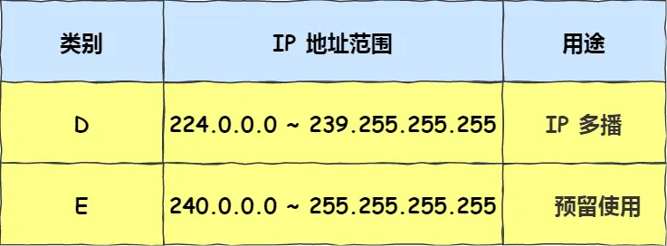 而 D 类和 E 类地址是没有主机号的,所以不可用于主机 IP,D 类常被用于多播,E 类是预留的分类,暂时未使用。