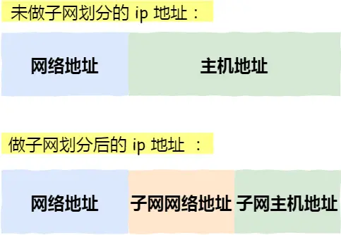 - 做子网划分后的 ip 地址:网络地址+(子网网络地址+子网主机地址)