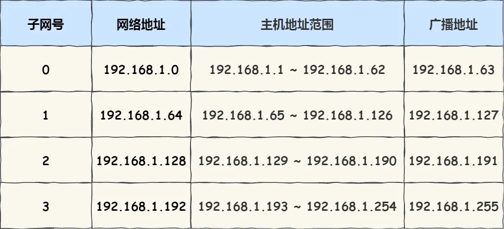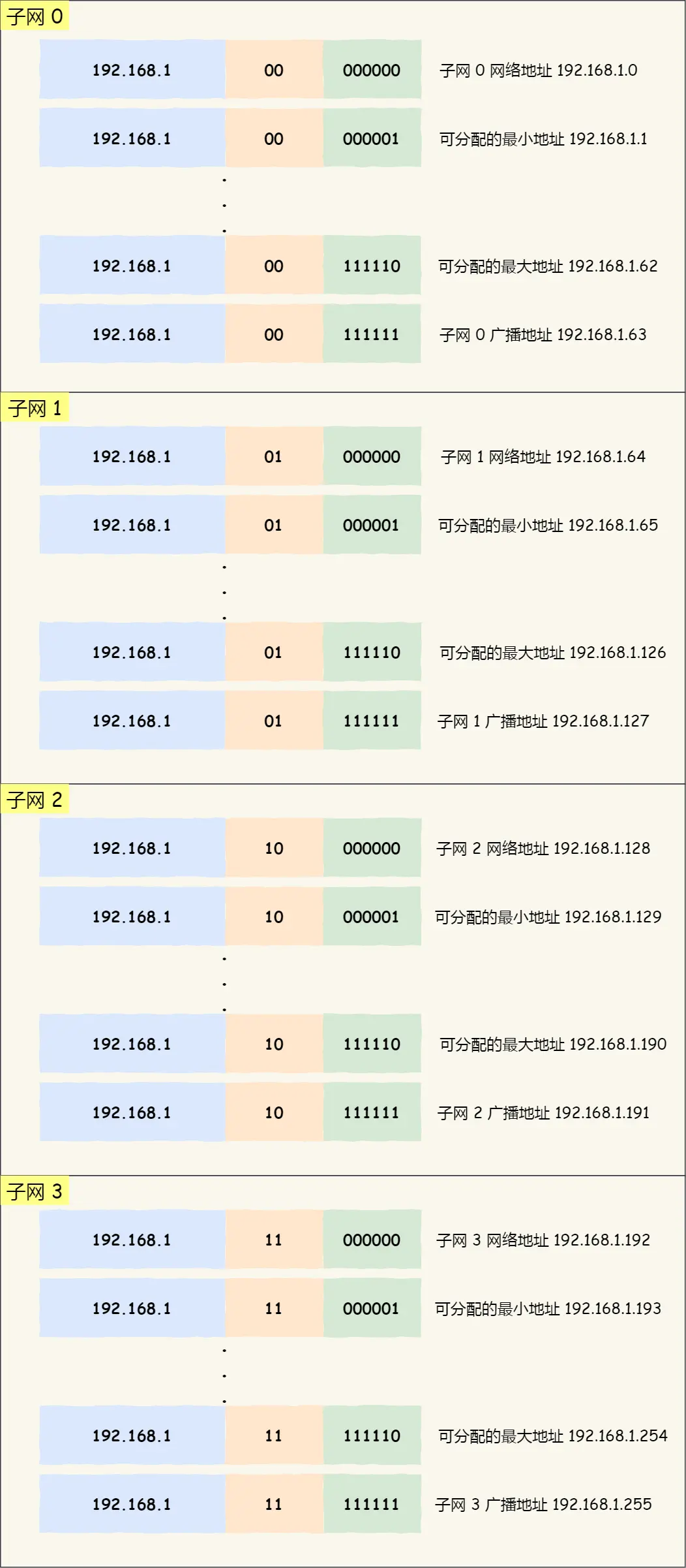 假设对 C 类地址进行子网划分,网络地址 192.168.1.0,使用子网掩码 255.255.255.192 对其进行子网划分。