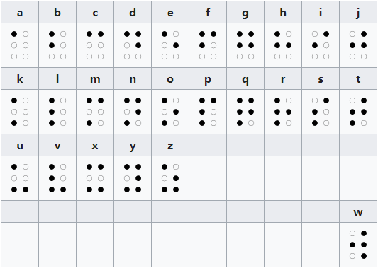 盲文的基本单位是长方形的盲符,有位置固定的六个点,每个点可以凸出或不凸出,形成64种可能。六个点的分布是左右两列,上中下三层。如图所示,左列自上而下称为1、2、3点,右列自上而下称为4、5、6点。