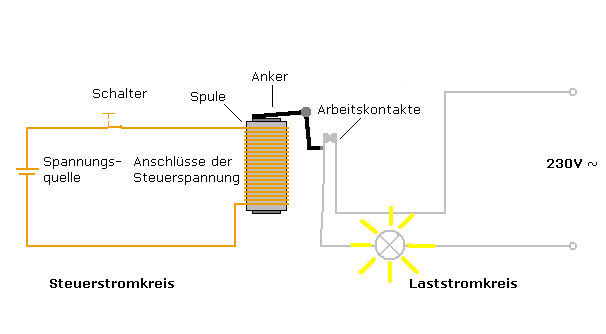 左侧开关(Schalter)闭合后,线圈产生电流,磁铁产生磁性。磁铁将金属条(Anker)吸附下来,使右侧的开关闭合,形成回路,于是电灯就亮了。