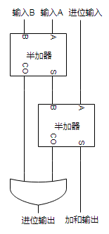 - 使用两个半加器,加上一个或门,就得到了一个完整的全加器;