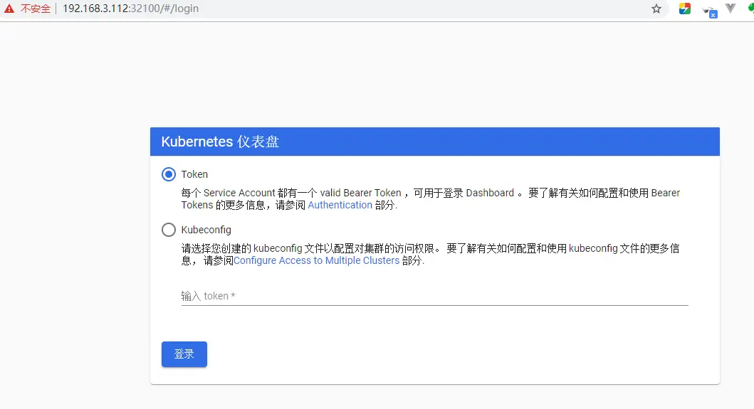 由于指定了端口可以通过https://192.168.3.112:32100,注意是443端口,所以是https访问。问题就来了,firefox访问没问题,chrome有问题,都是因为证书失效的原因,网上也有几种获取证书的方法,不再累述,这里我们因为是自己的环境,所以采用手工生成证书的方式。