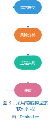 螺旋模型将瀑布模型和演化模型结合起来,不仅体现了两个模型的优点,而且还强调了其他模型均忽略了的风险分析。螺旋模型的每一周期都包括需求定义 、 风险分析 、 工程实现和评审4个阶段,由这4个阶段进行迭代,软件开发过程每迭代一次,软件开发就前进一个层次。采用螺旋模型的软件过程如图 3 所示。