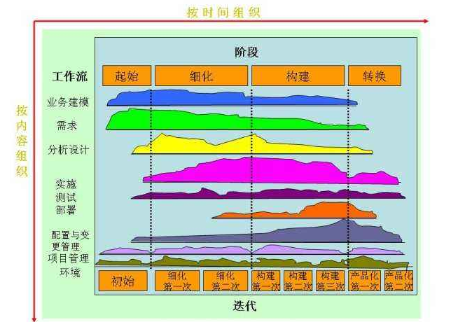 UP 是一个很有特色的模型,它本身是一个二维的结构,如图 1 所示。对于 UP 而言,时间主线就是横轴的阶段,随着时间的流逝,软件开发活动总要经过初始 、 细化 、 构建和交付这4个阶段方能完成。而纵轴的工作流程则描述了在不同的阶段需要进行的主要工作。例如在初始阶段,软件组织需要进行大量的调研,对软件进行业务建模 、 需求,同时进行一些设计以验证建模的合理性,还要进行一些实施甚至测试和部署的工作,用以验证需求和设计的工作及开发系统原型,当然配置与变更管理 、 项目管理和环境是在任何阶段都是不能缺少的。