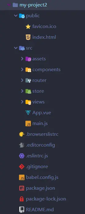 配置成功后,我们的项目目录下就会多出一个my-project2(这是我的项目名称)文件夹,打开这个文件夹,我们就可以看到这个项目的结构.我这里隐藏了node_modules文件夹.