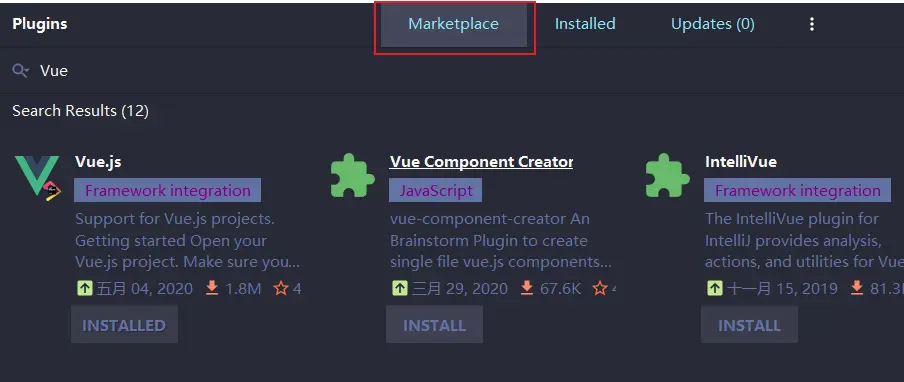 File->Settings->Plugins->选中Marketplace并搜索Vue,如图就是第一个Vue.js插件, 然后安装即可。安装后还需要重启webstorm.