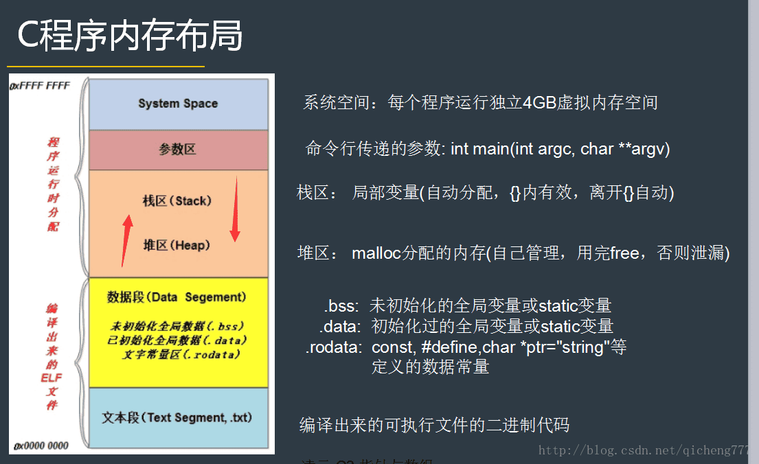 栈:存放函数的参数值(从右往左入栈),局部变量(非静态)、函数返回地址等值