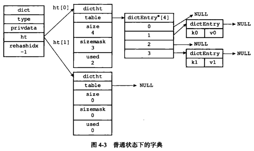 - 字典使用hashTable作为底层,「每个字典有两个哈希表」,一个平时使用,另一个仅在进行rehash时使用。