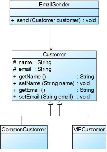 在Sunny软件公司开发的CRM系统中,客户(Customer)可以分为VIP客户(VIPCustomer)和普通客户(CommonCustomer)两类,系统需要提供一个发送Email的功能,原始设计方案如图5所示: