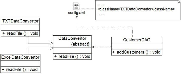 在编码实现图7所示结构时,Sunny软件公司开发人员发现该设计方案存在一个非常严重的问题,由于每次转换数据时数据来源不一定相同,因此需要更换数据转换类,如有时候需要将TXTDataConvertor改为ExcelDataConvertor,此时,需要修改CustomerDAO的源代码,而且在引入并使用新的数据转换类时也不得不修改CustomerDAO的源代码,系统扩展性较差,违反了开闭原则,现需要对该方案进行重构。