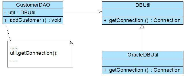 随着客户数量的增加,系统决定升级为Oracle数据库,因此需要增加一个新的OracleDBUtil类来连接Oracle数据库,由于在初始设计方案中CustomerDAO和DBUtil之间是继承关系,因此在更换数据库连接方式时需要修改CustomerDAO类的源代码,将CustomerDAO作为OracleDBUtil的子类,这将违反开闭原则。【当然也可以修改DBUtil类的源代码,同样会违反开闭原则。】