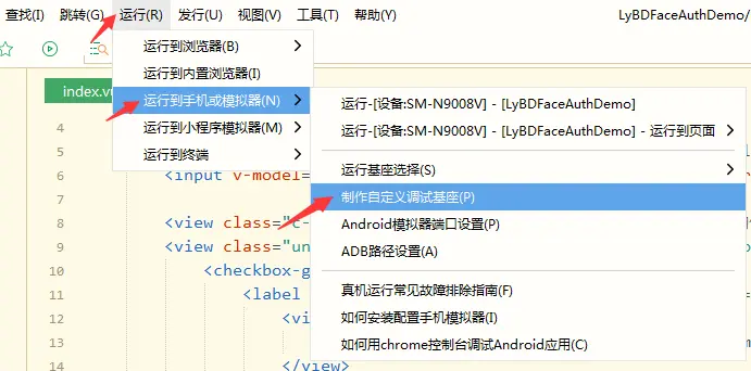 需要打自定义基座才可以进行测试,运行->运行到手机或模拟器->制作自定义基座。每次打自定义基座的时候,最好先把旧的基座删除(如果存在),路径在根目录下的 unpackage 文件夹里面(LyBDFaceAuthDemo\unpackage\debug\android_debug.apk)。
