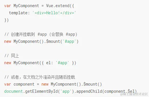 Vue实例还没有收到el选项,处于未挂载状态,可以使用vm.$mount()手动挂载一个未挂载的实例。如果没有传参,通过$el获根部取DOM元素,必须使用DOM api插入文档中。