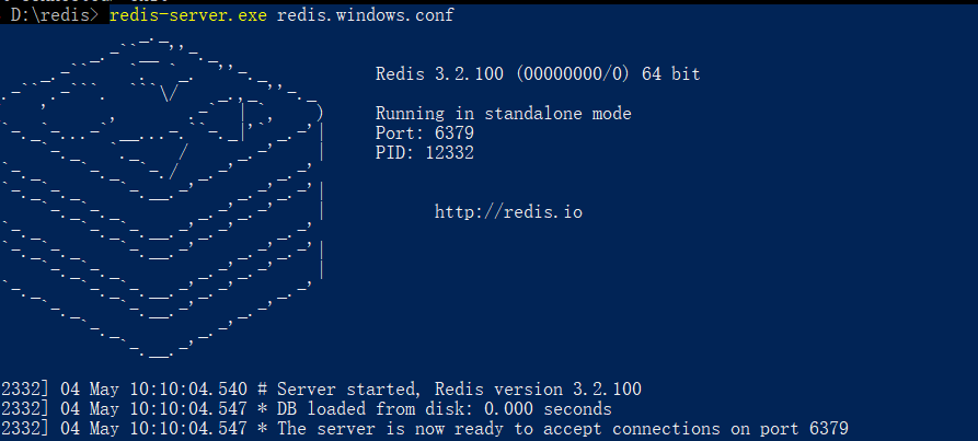redis-server.exe redis.windows.conf [17324] 04 May 10:08:37.857 # Creating Server TCP listening socket 127.0.0.1:6379: bind: No error(这是用于redis客户端已经启动)