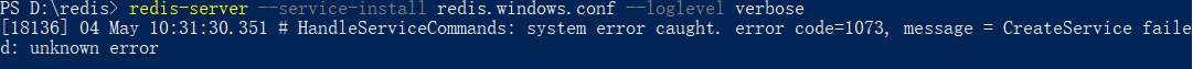 redis加入系统服务(redis-server --service-install redis.windows.conf --loglevel verbose)时报:HandleServiceCommands: system error caught. error code=1073, message = CreateService failed: unknown error