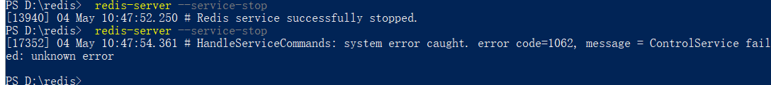 [17352] 04 May 10:47:54.361 # HandleServiceCommands: system error caught. error code=1062, message = ControlService failed: unknown error( redis-server --service-stop命令执行了两次!!!)