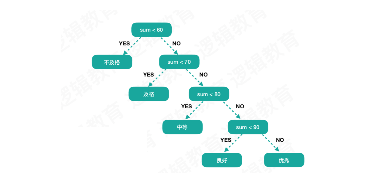 我们可以根据成绩分布所占比例(A:不及格,B:及格,C:中等,D:良好,E:优秀),来决定先对70-79范围进行判断,因为这个分数段的所占比例是最大的,从大到小依次进行判断。