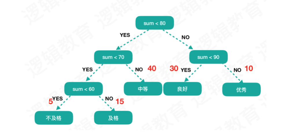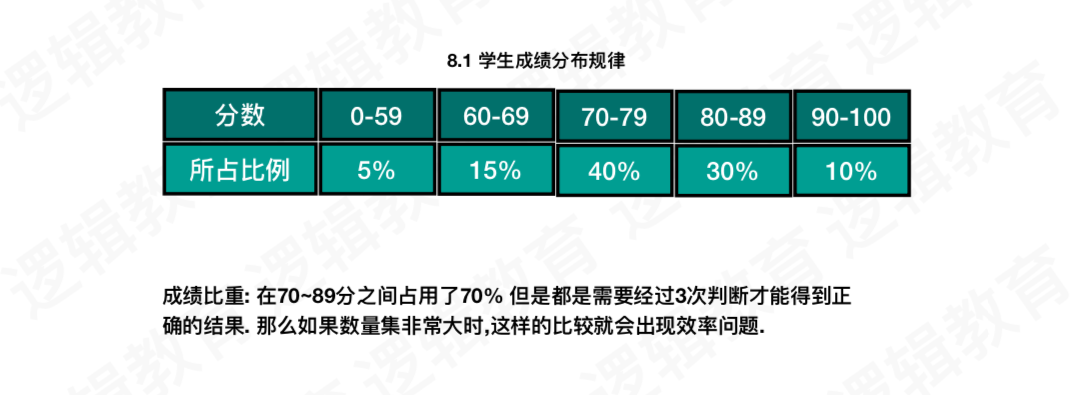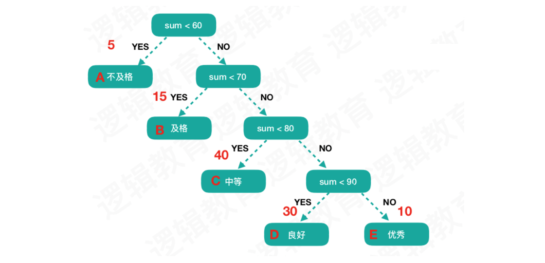 一般情况下,一张考卷的成绩大部分处于中等和良好的范围,优秀和不及格都是较少的,那么按照上边的程序,使得所有的成绩都需要先判断是否及格,再逐级向上判断,当数据当很大的时候,这样的算法是存在效率问题的。