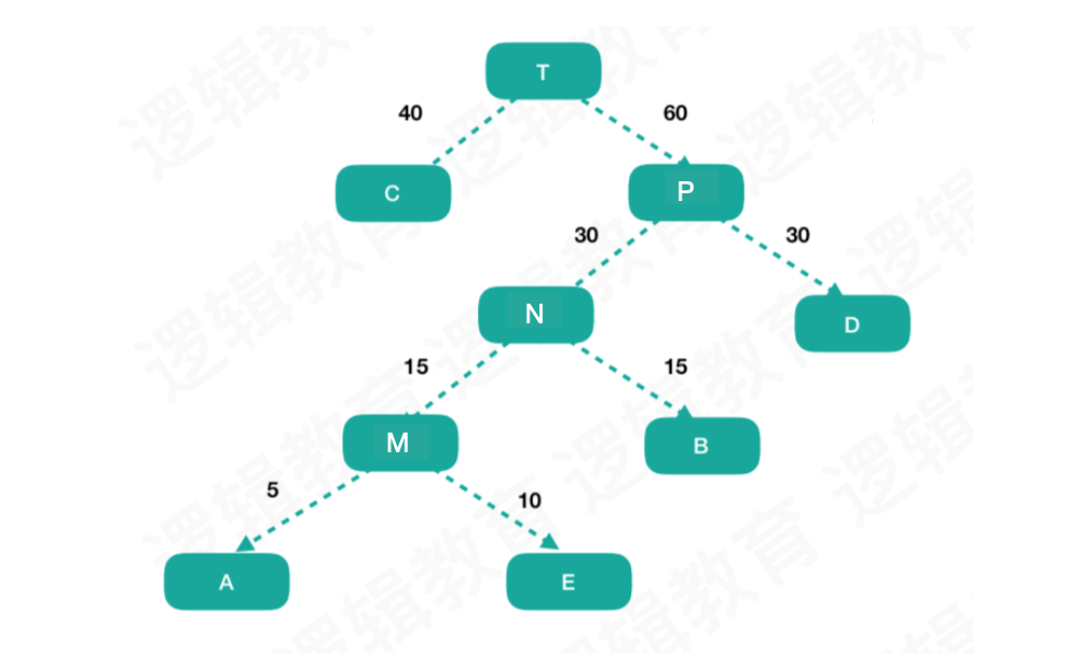 - 重复第二步,将M15和B15作为一个新结点N的两个子结点,新结点N的权值就是15+15=30,