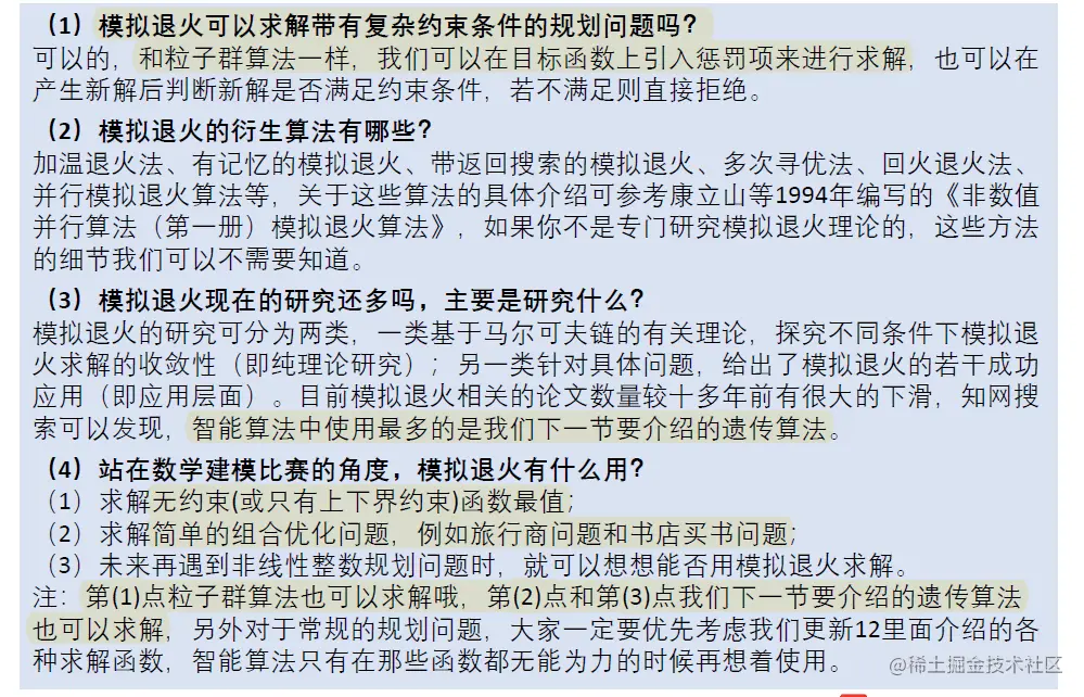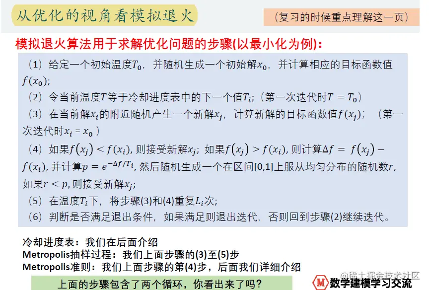 数学建模 模拟退火 赤西沽 2020-05-05 812 阅读1分钟 模拟退火、蒙特卡洛、穷举法: goal: 解决优化问题;求解某个“函数”的最值 蒙特卡洛是随机搜索,穷举法是按照某一规则来穷举整个解空间,不适合解空间特别大的问题,是盲目搜索方法 启发式搜索: 搜索过程中利用了中间信息来改进搜索策略,如模拟退火算法、粒子群、遗传算法、蚁群算法 模拟退火算法与粒子群算法相比的优点: 不仅能处理连续优化问题,还能很方便的处理组合优化问题 适用问题: