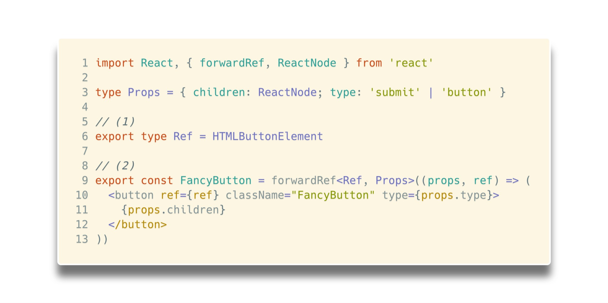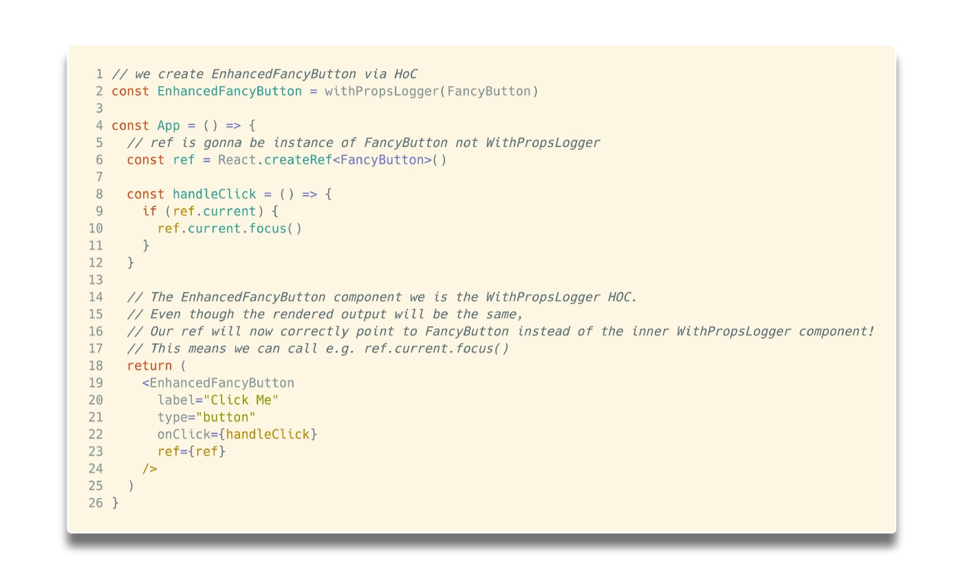 在下面的例子中,我们给组件加上Forwarding Refs,这样在必要的时候我们就可以通过ref直接访问这个组件内的button节点,就像我们直接使用button节点一样