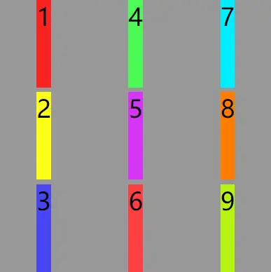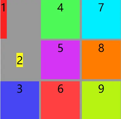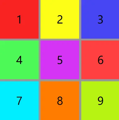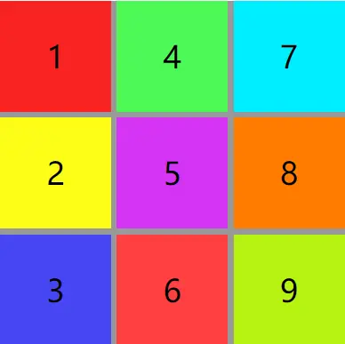 划分网格以后,容器的子元素会按照顺序,自动放置在每一个网格。默认的放置顺序是"先行后列",即先填满第一行,再开始放入第二行,即下图数字的顺序。