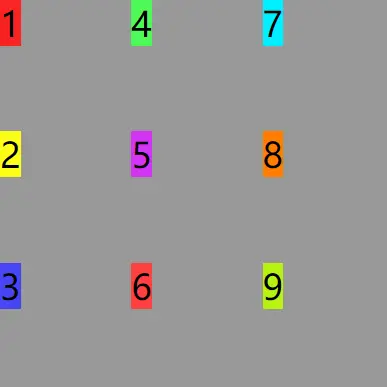 #grid-container { display: grid; width: 310px; background-color: #999; grid-template-rows: 100px 100px 100px; grid-template-columns: 100px 100px 100px; grid-gap: 5px; grid-auto-flow: column; justify-items: center;}