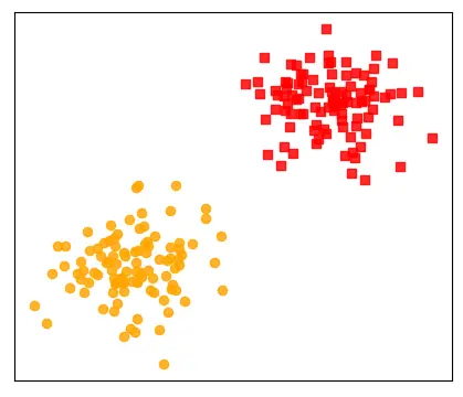 如图所示有两堆样本点,即二分类问题(Binary Classification),现在需要你建立一个模型来对新输入的样本进行预测,判断其应该属于那个类别。对于这个问题的描述用线性回归来解决肯定是不行的,因为两者本就属于不同类型的问题。退一步讲,即使是用线性回归来建模得到的估计也就是一条向右倾斜的直线,而我们这里需要的却是一条向左倾斜的直线。同时,回归模型的预测值都是位于预测曲线上的,而无法做到区分直线两边的东西。那既然用已有的线性回归解决不了,那我们可不可以在此基础上做一点改进以实现分类的目的呢?答案是当然可以。