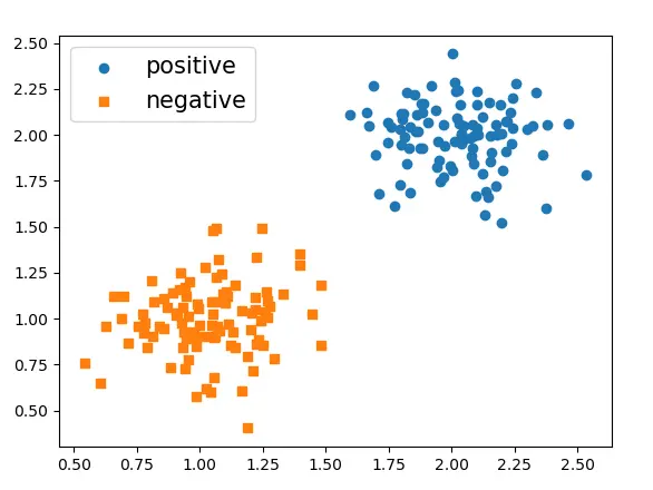 def make_data(): num_points = 200 centers = [[1, 1], [2, 2]] # 指定中心 x, y = make_blobs(n_samples=num_points, centers=centers, cluster_std=0.2, random_state=np.random.seed(10)) index_pos, index_neg = (y == 1), (y == 0) x_pos, x_neg = x[index_pos], x[index_neg] plt.scatter(x_pos[:, 0], x_pos[:, 1], marker='o', label='positive') plt.scatter(x_neg[:, 0], x_neg[:, 1], marker='s', label='negative') plt.legend(fontsize=15) plt.show() return x, y生成下图所示的数据集: