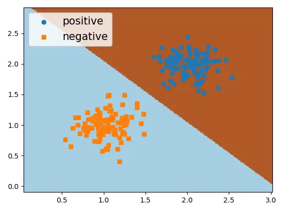 def decision_boundary(x, y): ########### 模型求解并预测 model = LogisticRegression() model.fit(x, y) pred = model.predict([[1, 0.5], [3, 1.5]]) print("样本点(1,0.5)所属的类标为{}\n样本点(3,1.5)所属的类标为{}".format(pred[0], pred[1])) ########### 绘制决策面 x_min, x_max = x[:, 0].min() - .5, x[:, 0].max() + .5 y_min, y_max = x[:, 1].min() - .5, x[:, 1].max() + .5 h = .02 # step size in the mesh xx, yy = np.meshgrid(np.arange(x_min, x_max, h), np.arange(y_min, y_max, h)) x_new = np.hstack([xx.reshape(-1, 1), yy.reshape(-1, 1)]) Z = model.predict(x_new) Z = Z.reshape(xx.shape) plt.pcolormesh(xx, yy, Z, cmap=plt.cm.Paired) ########### 绘制原始样本点 index_pos, index_neg = (y == 1), (y == 0) x_pos, x_neg = x[index_pos], x[index_neg] plt.scatter(x_pos[:, 0], x_pos[:, 1], marker='o', label='positive') plt.scatter(x_neg[:, 0], x_neg[:, 1], marker='s', label='negative') plt.legend(fontsize=15) plt.show() if __name__ == '__main__': x, y = make_data() decision_boundary(x, y) #结果: #样本点(1,0.5)所属的类标为0 #样本点(3,1.5)所属的类标为1训练完成之后,我们便可以绘制出如下所示的一个决策面,用于样本点的分类。