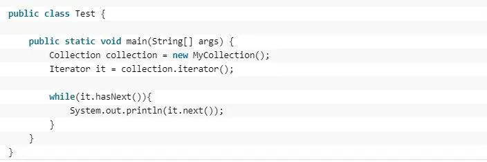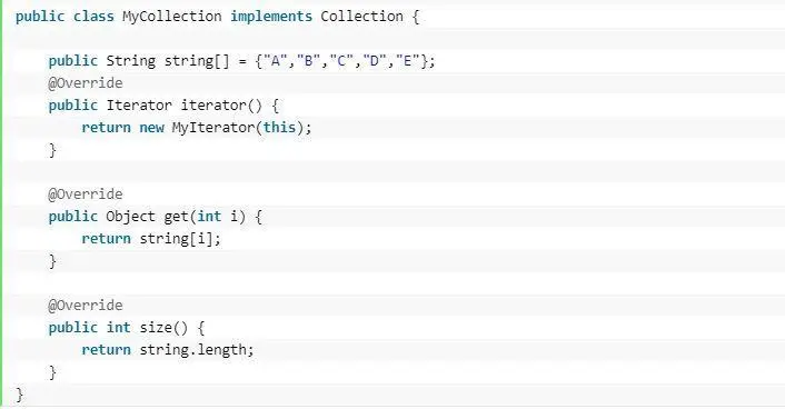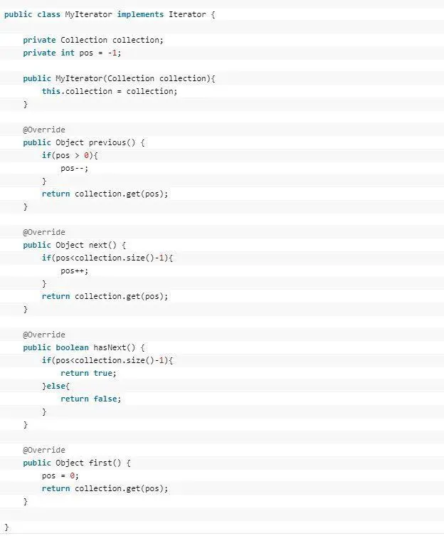 这个思路和我们常用的一模一样,MyCollection中定义了集合的一些操作,MyIterator中定义了一系列迭代操作,且持有Collection实例,我们来看看实现代码: