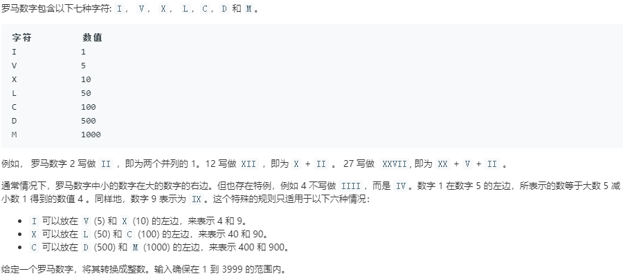 第一种方法是利用字典(哈希表)暴力破解,将所有可能出现的组合按照罗马数字作为key、阿拉伯数字作为value的格式存入字典中,对于输入的字符串,如果一个字符对应值小于其右边的值,那么这个组合必定是IV、IX、XL、XC、CD、CM其中一个。