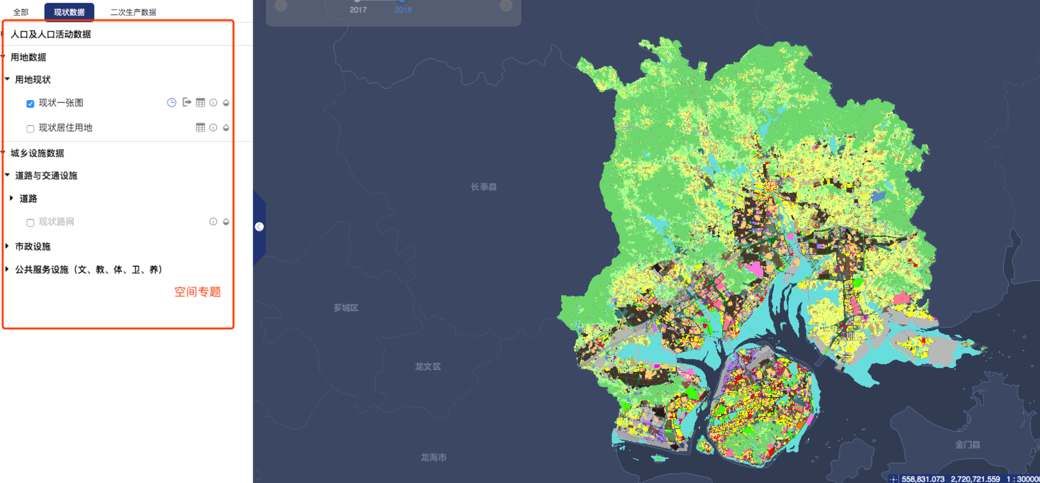 如图为空间专题,里面的叶子节点都是可以打开或关闭的图层(或者也可以说为一个专题,它可以按照实际需要结合用户需求可以包含多个图层数据,简单来说就是一个地图服务可以包括多个图层),目前打开的图层已经显示在地图上。因此后面说的专题,其实也可以是指专题目录这样一棵树。